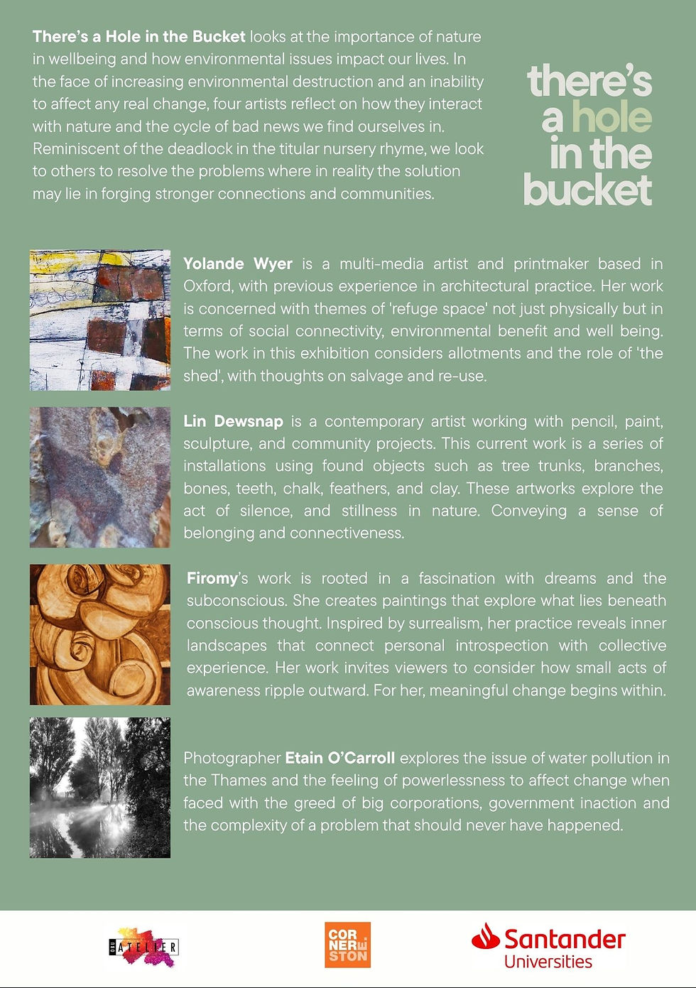 There's a Hole in the Bucket looks at the importance of nature in wellbeing and how environmental issues impact our lives. In the face of increasing environmental destruction and an inability to affect any real change, four artists reflect on how they interact with nature and the cycle of bad news we find ourselves in.